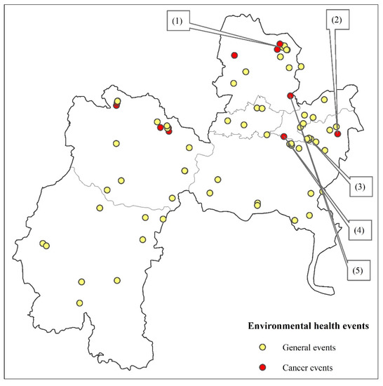 Locations with environmental health event reports. Note: the points do not represent accurate geographical coordinates of the events, but refer to the approximate locations and their adjacent regions according to the media reports; general events refer to the events which cause uncomfortableness or health ailments in humans, and cancer events refer to the events which are mainly related to cancer and cancer risks.