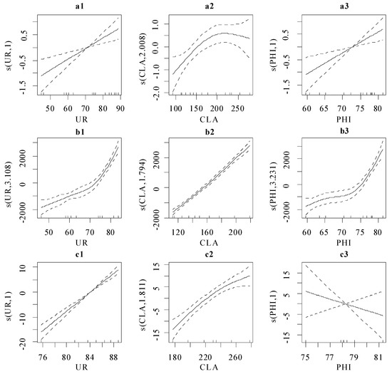 The specific effects of these urbanization factors on health are shown in Figure 7. The total mortality grew linearly with increases in UR and PHI (Figure 7(a1,a3)), and generally showed nonlinear growth along with an increase in CLA (Figure 7(a2)). The number of cancer cases nonlinearly increased along with the three factors, but the nonlinear relationships were more significant between the number of cancer cases and UR and PHI (Figure 7(b1–b3)). The mortality of cancer exhibited linear growth and nonlinear growth with increased UR and CLA, respectively (Figure 7(b1,b2)). Figure 7(b3) shows that the mortality of cancer linearly decreased with an increase in PHI, but the explained deviance (15.7%) and adjusted R2 (−0.01) proved that the relationship was non-significant and unreliable. In addition, the simple linear regression (SLR) was calculated for comparison with the GAM. The estimated coefficient generally confirmed the relationships identified by the GAM, but the SLR showed disadvantages when the relationship between dependent and independent variables was complicated or nonlinear, because they yielded a lower R2 than that of the GAM (Table 2).