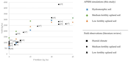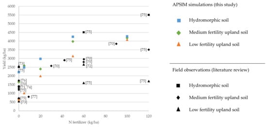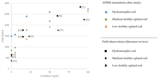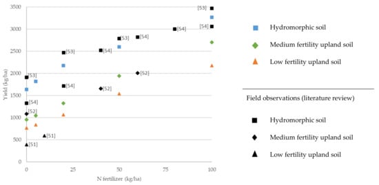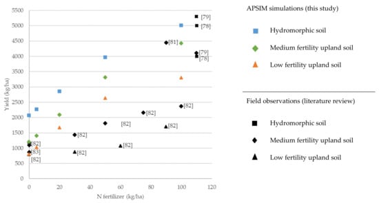 Rice production is shown in Figure 5. Right after the 100 kg N ha−1 mark of the x-axis, literature data without information on the rate of fertilizers applied was plotted: maximum and mean plus standard deviation rainfed yields recorded across different savanna sites with a length of the growing period above 90 days [,], and average yields of high-yielding farmers [], without explicit descriptions of the intensity of fertilization. This data helps to assess the plausibility of the simulated yields, given the scarcity of experimental studies on high-input rainfed rice, showing good agreement with the simulated yields of the most productive plots., Moreover, yields at fertilizer application rates of 100 kg N ha−1 are similar to those simulated with CERES at rates of 90 kg N ha−1 in the humid zone of Ghana []. Rice yield data at fertilization rates lower than 100 kg N ha−1 have been gathered from one single study [] conducted in both upland and lowland fields (assumed to correspond to low fertility soils and hydromorphic soils, respectively) in the Sudanian zone of Burkina Faso and Mali. Yields in non-fertilized soils coincide with some of the observations reported in the literature [,].