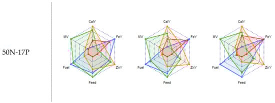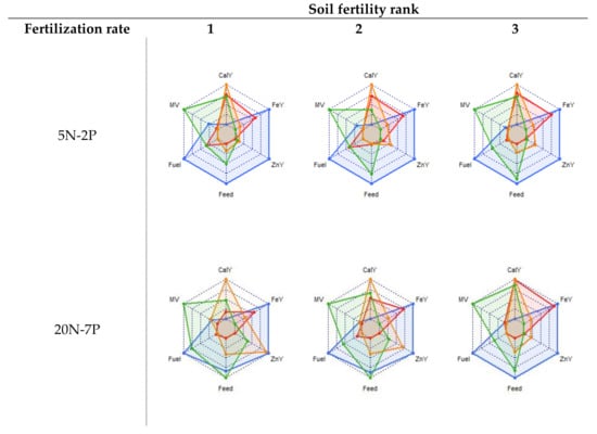 Multi-criteria yield assessments on an area-scaled basis (per hectare) of millet (blue), sorghum (red), maize (yellow) and rice (green); in six different paddocks, defined by two factors: mineral fertilizer application rate (kg ha−1 of nitrogen and phosphorus) and soil fertility characteristics (1 = upland low fertility, 2 = upland medium fertility, 3 = hydromorphic soil). Caloric yield (CalY); iron yield (FeY); zinc yield (ZnY); metabolizable energy yield (feed), cooking fuel yield (fuel), monetary value (MV).