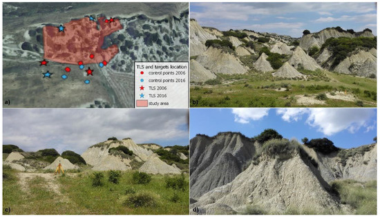 (a) 3D view of the study area and location of TLS and control points in both 2006 and 2016 surveys; (b) the surveyed biancana landscape characterised by isolated domes at the middle and at the base of the slope; (c) dome-shaped features at the base of a slope, showing one of the highest-resolution control points (targets) used to overlap the scans; (d) a typical dome-shaped feature with vegetation on its top; rills are visible on the slope.