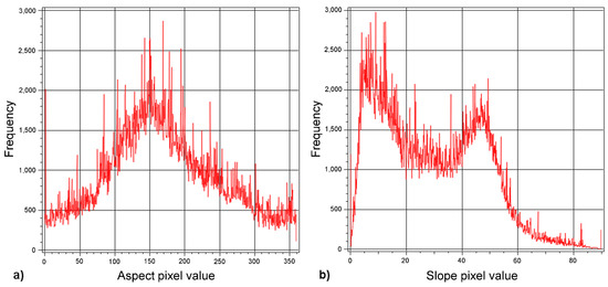 (a) Pixel value frequency of the aspect raster that shows the exposure of biancane relief; the highest frequency is between 90 and 220, that is, from E-SE to SW; (b) pixel value frequency of the slope raster; although most pixel values are lower than 40°, several pixels have values over 60°, and a secondary peak is visible around a value of 50°.