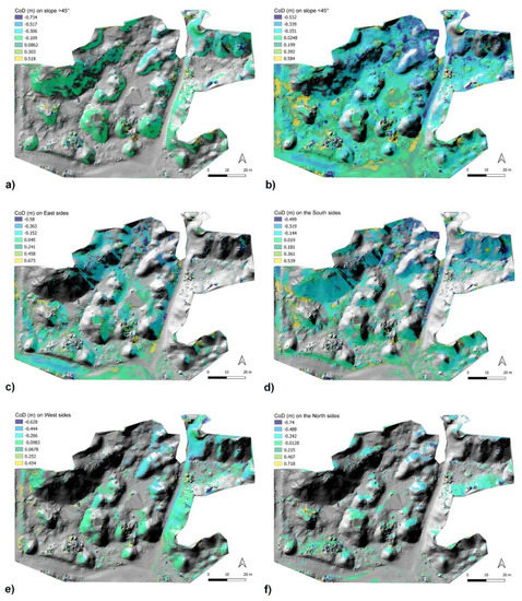 The CoD rasters selected according to the side slope angles: (a) greater than 45° and (b) lower than 45°; and the side exposures facing: (c) east, (d) south, (e) west, and (f) north. The CoD values are in metres.