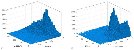 Bivariate histograms calculated by comparing the CoD values with (a) the exposures and (b) the slope angles; the CoD values ranged between −1 and 0 metres.