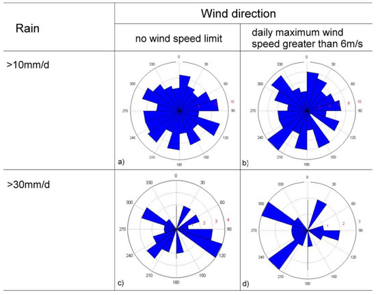 Wind directions during events with: (a) rainfall rates greater than 10 mm/d; (b) rainfall rates greater than 10 mm/d and daily maximum wind speeds greater than 6 m/s; (c) rainfall rates greater than 30 mm/d; and (d) rainfall rates greater than 30 mm/d and daily maximum wind speeds greater than 6 m/s. The number of days is shown in red.
