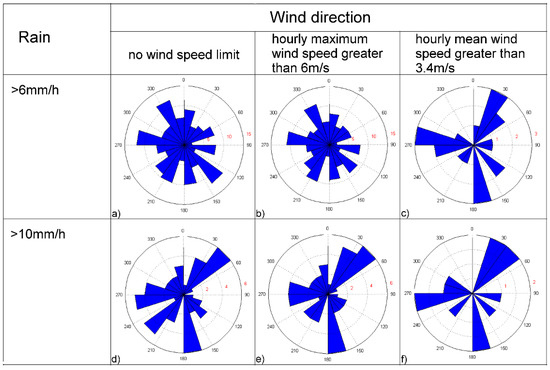 To support the contemporary occurrence of both intense rain and intense wind, we also analysed the hourly data. According to the rainfall intensity classification [56] (Table 1), rainfall rates between 2.5 and 10 mm/h are considered moderate, while rainfall rates over 10 mm/h are considered heavy. We took into account the wind directions during events with rainfall rates > 10 mm/h and those with rainfall rates > 6 mm/h, since the latter is the rainfall intensity that causes significant erosion according to Foulds and Warburton [57]. We then combined the rain events with rainfall rates > 10 mm/h and >6 mm/h with contemporaneous occurrences of hourly mean wind speeds greater than the threshold representing a gentle breeze on the Beaufort scale [35]. This value is 3.4 m/s and also corresponds to the middle of the ascending stretch of the graph in Figure 3 in Schmidt et al. [36], showing raindrop diversion from the vertical direction as a function of wind speed. Since hourly mean wind speeds greater than 3.4 m/s rarely occur, we also investigated rain events with rainfall rates > 10 mm/h and >6 mm/h that occurred contemporaneously with maximum hourly wind speeds greater than 6 m/s, corresponding to a moderate breeze, that is, the wind speed over which the splash and sheet erosion process increases significantly [39].