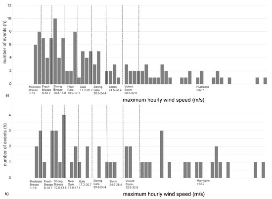 Analysing the events, most of the time, rainfall amounts > 6 mm are characterised by associated moderate to strong breezes (Beaufort scale [35]), while events with more intense winds are less frequent (Figure 9a), and their quantities decrease with increasing wind speeds. Hourly rainfall amounts >10 mm are frequently combined with strong breezes, followed by winds from moderate to fresh breezes, and many events are linked to near-gales or gales (Figure 9b).