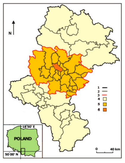 Figure 1. Location of the studied city (Sourced by authors). Explanations: 1—Silesian province boundary; 2—county and commune boundaries; 3—Katowice conurbation boundaries; 4—area of the Silesian province outside the Katowice conurbation; 5—area of the Katowice conurbation; 6—city of Bytom discussed in the paper.