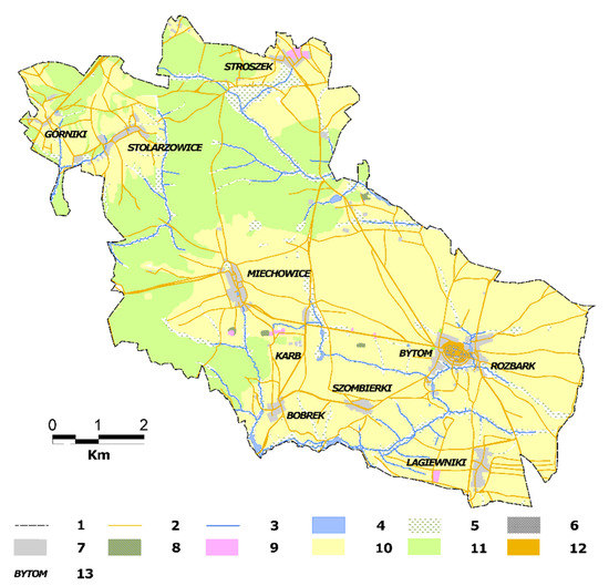 74. Krawczyk, J.A.; Nadolski, P. Atlas Geograficzny Bytomia. [The Geographical Atlas of Bytom]; City Hall in Bytom: Bytom, Poland, 2007; p. 40. [Google Scholar]