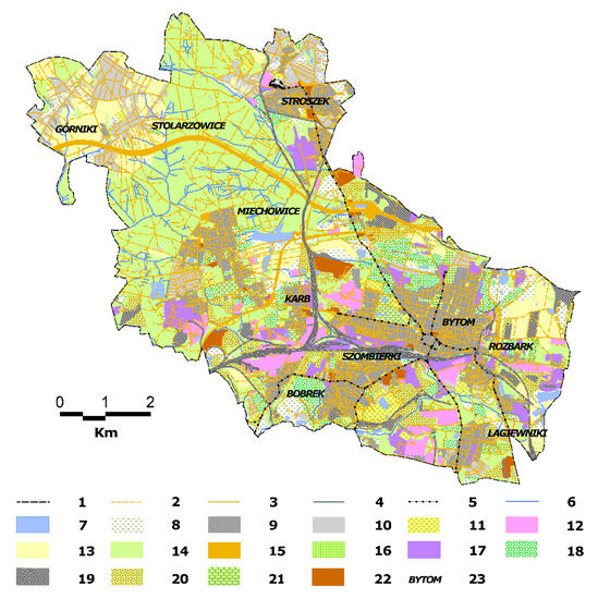 Figure 6. The land use of the area of Bytom in 2019 (Sourced by authors on the basis of https://mapy.orsip.pl/imap/?gpmap=gp1-2) (accessed on 1 November 2020). Explanations: 1—current city border; 2—dirt roads; 3—paved roads; 4—railway lines; 5—tram lines; 6—water courses; 7—water reservoirs; 8—meadows; 9—dense buildings; 10—dispersed buildings, railway areas; 11—sports facilities; 12—industrial areas; 13—arable fields, fallow lands; 14—forests and trees; 15—road areas; 16—cemeteries; 17—postindustrial areas; 18—allotment gardens; 19—dumps; 20—wastelands, landfills; 21—parks, squares, and lawns; 22—malls; 23—topographic names.