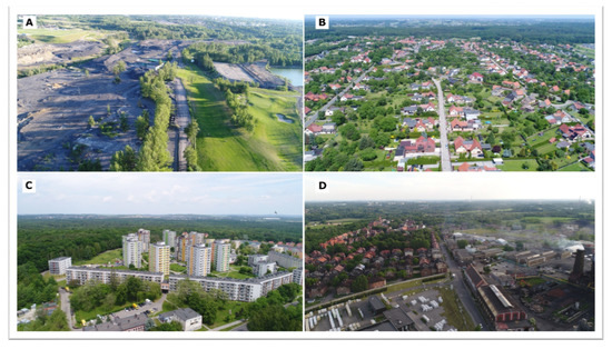 Figure 7. Selected landscapes of Bytom in 2021 (Sourced by authors). Explanations: (A)—Reclaimed areas of the former the Szombierki Coal Mine; (B)—Single-family housing in the agricultural district of the Stolarzowice; (C)—Housing estate in the Miechowice district; (D)—The workers’ housing estate from the beginning of the 20th century (Nowa Kolonia Robotnicza) and a coking plant in the Bobrek district.