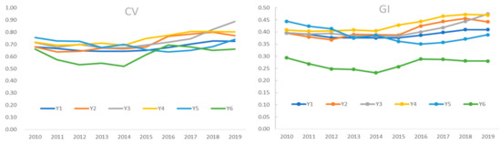 The spatial inequality in China’s housing market is very significant and already in an unreasonable state due to different development stages, resource endowments, and location conditions, and it is getting more serious with the development. The coefficients of variation of in 2019 were 0.73, 0.77, 0.89, 0.80, 0.74, and 0.66, respectively, all greater than 0.36, indicating that the spatial variability in the interprovincial housing market in China was highly significant. From 2010 to 2019, the coefficient of variation of gradually increased in fluctuations, and achieved a rapid growth in particular, indicating that the spatial inequality in the housing market development supply and demand in China was increasing over time. On the contrary, the coefficient of variation of and declined by year in the fluctuation, indicating that the degree of spatial inequality in deinventory and housing prices in China’s housing market was gradually decreasing, which showed convergence. In 2019, the Gini coefficients of were 0.41, 0.44, 0.47, and 0.47, all greater than 0.4, indicating that the level of inequality was beyond a reasonable range and in an urgent need for optimization and adjustment. Meanwhile, the Gini coefficients of and were 0.39 and 0.27, respectively, both less than 0.4, indicating that the inequality remains within a reasonable level. From 2010 to 2019, all the Gini coefficients of showed a tendency to go down first and then up, which was similar to the coefficient of variation in the change pattern but somewhat different in the fluctuation range and development trend. Specifically, the Gini coefficients of and decreased slightly and then increased, and generally, they remained stable; the Gini coefficients of decreased slightly and then increased significantly, showing a tendency of rapid increase in fluctuation in general; the Gini coefficients of decreased significantly and then increased slightly, generally showing the tendency of rapid decrease in fluctuation (see Table A1 and Table A2 and Figure 4).