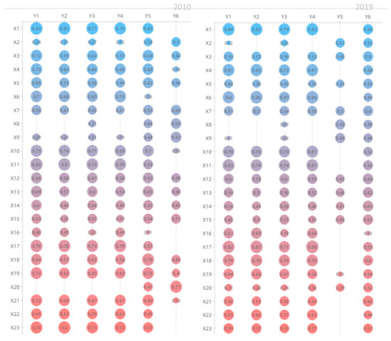 In 2019, failed to pass the significance test, and and could only pass the loose significance test of 10%, while the rest of the factors could pass the significance test of 5% and a more stringent level. At the significance level of 5%, the factors were classified into high, medium, and low types according to the classification principle of “3:4:3” based on the strength of the direct force of the factors. Among them, Gross Domestic Product, Added Value of Secondary Industry, Number of Medical Beds, Expenditure, Permanent Resident Population, and Number of Buses are of the high type; Total Retail Sales of Consumer Goods, Number of City Parks, Length of Bus Line, Number of Medical Institutions, Added Value of Tertiary Industry, City Park Area, Urban Green Area, and Revenue are of the medium type; Output Value of Financial Industry, Exports, Floating Population, Imports, Amount of Loan, and Urban Rail Transit Line Length are of the low type. In 2010, and failed to pass the significance test, while the rest of the factors could pass the significance test of 5% and a more stringent level. At the significance level of 5%, Gross Domestic Product, Added Value of Secondary Industry, Number of Medical Beds, City Park Area, Total Retail Sales of Consumer Goods, and Expenditure are of the high type; Revenue, Amount of Loan, Permanent Resident Population, Added Value of Tertiary Industry, Output Value of Financial Industry, Length of Bus Line, Urban Green Area, and Number of City Parks are of the medium type; Per Capita GDP, Floating Population, Per Capita Disposable Income of Residents, Number of Medical Institutions, Imports, and Exports are of the low type.