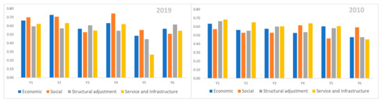 There were nine factors that increased in force from 2010 to 2019, including , , , and with a greater enhancement; and 13 decreased, including , , , , , and with a greater fall. It should be noted that consistently failed the significance test, and degenerated to pass only the significance test of 10%, while evolved to pass the significance test of 5%. There was a great difference in the ranking of driving factors between 2010 and 2019, with the former being Service and Infrastructure > Structural Adjustment > Economic > Social and the latter being Social > Economic > Service and Infrastructure > Structural Adjustment (see Table A1 and Table A2 and Figure 6, Figure 7 and Figure 8).