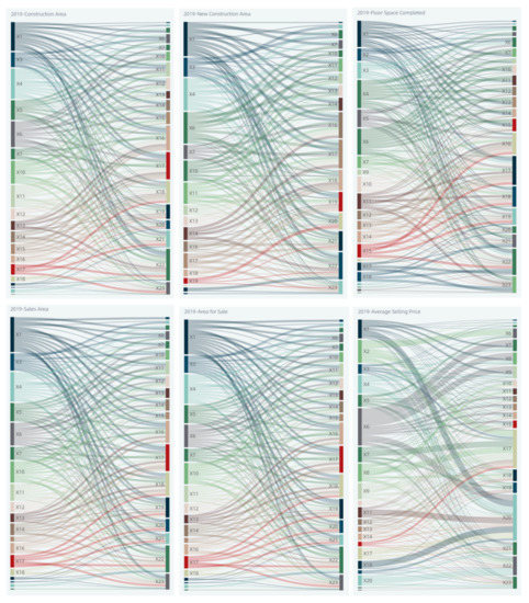 In 2019, , , and failed to pass the significance test, and and could only pass the loose significance test of 10%, while the rest of the factors could pass the significance test of 5% and a more stringent level. At the significance level of 5%, the factors were classified into high, medium, and low types according to the classification principle of “3:4:3” based on the strength of the direct force of the factors. Among them, Gross Domestic Product, Expenditure, Permanent Resident Population , Added Value of Secondary Industry, and Number of Buses are of the high type; Total Retail Sales of Consumer Goods, Number of Medical Institutions, Number of City Parks, City Park Area, Added Value of Tertiary Industry, Revenue, and Urban Green Area are of the medium type; Output Value of Financial Industry, Floating Population, Export, and Urban Rail Transit Line Length are of the low type. In 2010, and failed to pass the significance test, while the rest of the factors could pass the significance test of 5% and a more stringent level. There were 11 factors that increased in force from 2010 to 2019, including , , , , and with a greater enhancement; and 11 decreased, including , , , , , and with a greater fall. It should be noted that consistently failed the significance test, and degenerated to pass only the significance test of 10%, while evolved to pass the significance test of 5%. At the significance level of 5%, Gross Domestic Product, City Park Area, Added Value of Secondary Industry, Number of Medical Beds, Total Retail Sales of Consumer Goods, and Urban Green Area are of the high type; Expenditure, Permanent Resident Population, Length of Bus Line, Number of City Parks, Revenue, Added Value of Tertiary Industry, Output Value of Financial Industry, and Number of Buses are of the medium type; Floating Population, Amount of Loan, Exports, Imports, Number of Medical Institutions, Per Capita GDP, and Per Capita Disposable Income of Residents are of the low type. There was a great difference in the ranking of driving factors between 2010 and 2019, with the former being Service and Infrastructure > Economic > Structural Adjustment > Social, and the latter being Economic > Social > Service and Infrastructure > Structural Adjustment (see Table A1 and Table A2 and Figure 6, Figure 7 and Figure 8).