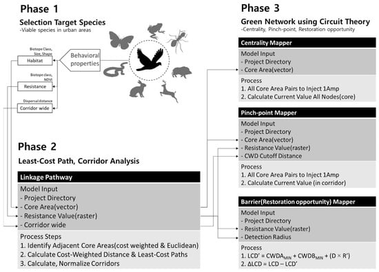 In this study, we selected (1) viable target species in urban areas for analysis of green network and distinguished the core green areas where target species can inhabit. (2) A least-cost path analysis was conducted considering the characteristics of the substrate surface and the cost weighted distance between green areas. (3) By analyzing the centrality, pinch-points and restoration opportunities using circuit theory, the relative importance of each green area, path and corridor was identified and areas requiring additional green space were identified. The overall research process is presented in Figure 2 and the following sub-chapter details each step.