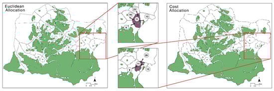 A total of 117 pairs of neighbors were found to be adjacent, of which 109 were adjacent according to a simple straight line using Euclidean allocation and 107 were found to be adjacent using cost allocation reflecting the resistance surface (Table A1 in Appendix A).
