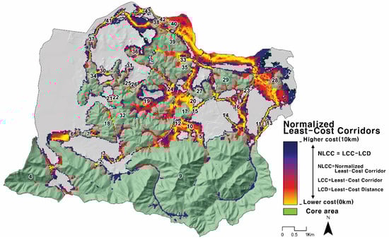The least-cost corridor analysis results for verifying the extent and effectiveness of the gangway area are shown in Figure 8 below. A wide corridor with a lower cost than the least-cost corridor was formed around the wetlands and development-restricted zones around the Kumho River and a least-cost corridor was also found around the arable land near the No. 28 core green area. On the other hand, the corridor area across the street was quite narrow. Considering that the least-cost path and corridors are formed around the extrusion of the core green area, it is believed that extrusions of green areas are effective in attracting target species through the city to green areas. This shows significant similarities to the fence dispersion and fence effects of patches claimed by Forman [].