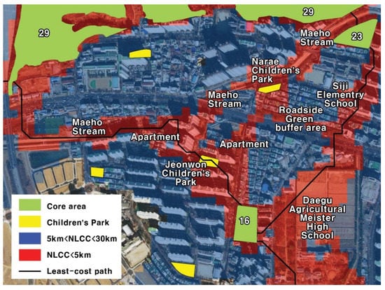 In addition to the least-cost path, corridor areas have been identified and these areas are particularly likely to be used as alternative routes. For example, the least-cost path between core green areas No. 16 and No. 23 was set to pass through high schools and elementary schools, but the least-cost corridor were derived using apartment landscaping green areas, small rivers and roadside buffer green areas (Figure 9). Areas where this alternative corridor can be established are considered extremely valuable in terms of preserving connectivity.