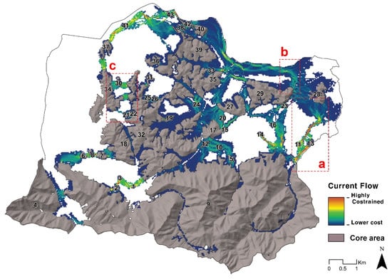 A pinch-point is a point where mobility is concentrated within a corridor when the target species moves from habitat to substrate surface to other habitats. Generally, these points appear in the shape of a funnel and due to the highly concentrated flow of species, the impact of disturbance on overall connectivity is very high [], i.e., difficult to replace the path, so even a small area loss can eventually pose a huge risk to the entire green network. To identify these pinch-points, Pinch-point Mapper [] was utilized in this work. Pinch-point Mapper has the advantage of using Circuitscape to schematize current flow over core green area pairs connected directly to the least-cost path. An electric current of 1 Amp was injected from one core green area and the other was set to ground. The current then flows through the gangway area, setting the point where the flow of charges within the gangway area was concentrated as a pinch-point.