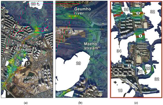 First, green areas 11, 13 and 14 were analyzed to be vulnerable to isolation as the width of the corridor connecting to the adjacent green areas was narrow and the movement of species within the corridor was concentrated at certain points. Looking at the flow leading to 9-11-13-28, we can see pinch-point in the small-scale forest and Wooksu stream behind the middle ground and the pinch-pint was mitigated (Figure 12a) by widening the gangway width outside the market. In addition, if you look at the flow from area 29 to the Kumho River, which is located north of the target site, you can see that the surrounding substrate surface is dominated by agricultural land, but the pinch-point occurs along Maeho Stream (Figure 3, Figure 4, Figure 5, Figure 6, Figure 7, Figure 8, Figure 9, Figure 10, Figure 11, Figure 12 and Figure 13b). In addition, to these reservoirs, the flow was found to be concentrated in the water purification plants near No. 5, 6, 10 and 12. It tells us that it is necessary to consider not only green but also water space together when planning a green network. If you look at the connections between 32 and 34, they are connected by corridor ①32-34, ②32-22-21-34, ③32-30-34 and the least-cost path is formed in corridor ① and ③ (Figure 3, Figure 4, Figure 5, Figure 6, Figure 7, Figure 8, Figure 9, Figure 10, Figure 11, Figure 12 and Figure 13c). However, the pinch-point is high in the case of the two corridor. Therefore, it is believed that increasing the amount of green near the corridor of ② will alleviate the pinch-point of corridor of ① and ③.
