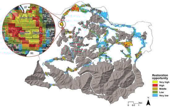 Restoration opportunity map (Restoration opportunities were classified into five grades. Yellow is the area with No. 34 and 37 has been expanded as an example).