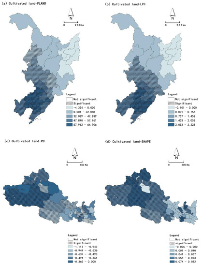 First, as shown in Figure 2, the empirical analysis results show that, at the level of p < 0.10, the impact of LEI on cultivated landscape is more significant in the northwest and northeast of China. In Northwest China, 50.88% of patches showed a significant negative relationship between LEI and cultivated land PD, and 52.63% of patches showed a significant positive relationship between LEI and cultivated land SHAPE. In Northeast China, LEI showed significant and positive relationship with cultivated land PLAND and cultivated land LPI of 63.89% of the patches. We hypothesized that, in Northeast China, the population aggregation effect brought by the compact growth pattern of infilling protects a large area of cultivated land in the suburbs and rural areas of the region, promotes the centralized development and utilization of contiguous cultivated land resources at the periphery of the city, and alleviates the loss of cultivated land. However, the outlying growth pattern is easy to occupy cultivated land resources, resulting in the decrease of the proportion of cultivated land and the decrease of the largest patch area, which is not conducive to the intensive use of cultivated land. However, in Northwest China, we noticed that, although the compact urban pattern prevented the fragmentation of cultivated landscape, it caused the complexity of cultivated landscape shape. The cultivated land in the west is small and scattered. We speculate that the higher intensity of human disturbance caused by the more compact urban pattern has divided the scarce cultivated land resources, resulting in the irregular landscape patches.