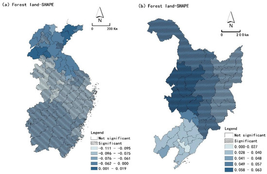 Influence of LEI on forest landscape at the level of p < 0.10 (a) Significant relationship between LEI and forest land SHAPE in East China; (b) Significant relationship between LEI and forest land SHAPE in Northeast China.