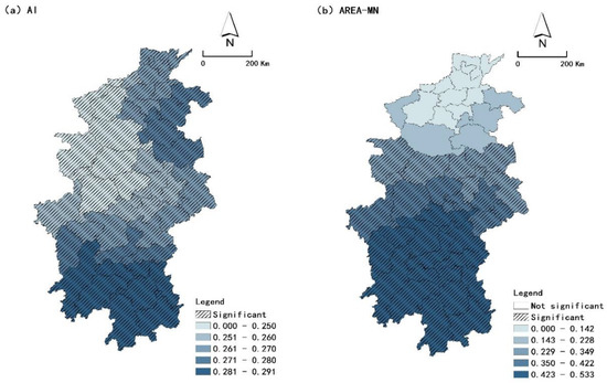 Influence of LEI on landscape at the level of p < 0.05 (a) Significant relationship between LEI and Al in Central China; (b) Significant relationship between LEI and AREA_MN in Central China.