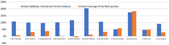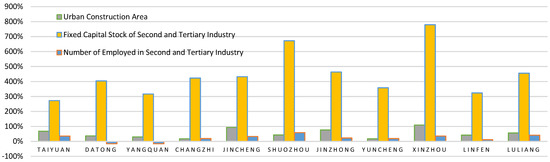It is clear that there is a 300–800% increase in investments into the fixed-capital stock for the secondary and tertiary industries among the cities. The area for urban construction increased from 20% to 100% in 2015 from 2006. Meanwhile, the number of people employed by the secondary and tertiary industries show variations among cities, with 500,000 more people employed in 2015 above the 1.4 million in 2006 for Taiyuan. Figure 2 shows a clear increase from 50 to 200% for value added, with a reduction of 7%, and various increases of up to 180% for the green coverage of built-up areas.