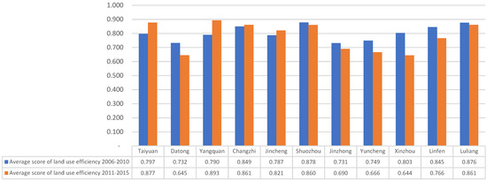 The comprehensive reform was introduced in 2005. Therefore, comparisons of the calculated average scores of land use efficiencies for each of these cities were made between the two periods (i.e., before [2006–2010] and after [2011–2015]). The widened range of the average scores of land use efficiencies among the cities for the two periods is revealed in Figure 3. Four cities (Taiyuan, Yangquan, Changzhi, and Jincheng) have improved their land productivities during 2011–2015. Other cities have reduced their average scores of land use efficiencies after the comprehensive reform.