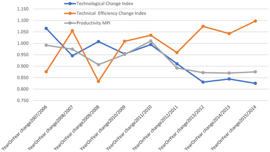 where in (3) and (4), denotes the extent of efficiency change to the frontier from t1 to t2, representing the change in technical efficiency. Further, denotes the extent of technological change to the frontier from t1 to t2, reflecting the technological change. This research method has been applied to many applications, including the assessment of the productive performance of countries [41], financial institutions [42,43], manufacturing industries [44], and the like.