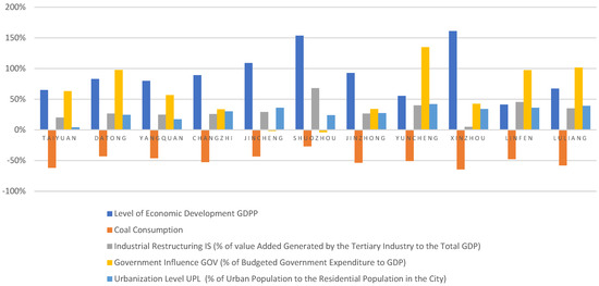 Third, from the perspective of the attributing factors, economic development and industrial upgrading significantly positively impacted urban land use efficiency. Industrial structure and government influence on economic transformation have an enabling influence, while the level of the urban population had a negative and less notable effect. This explains why Taiyuan has the highest score of land use efficiency as a result of being the capital city of the province, with the highest GDPP and value added by the tertiary industry, and the least by coal consumption.