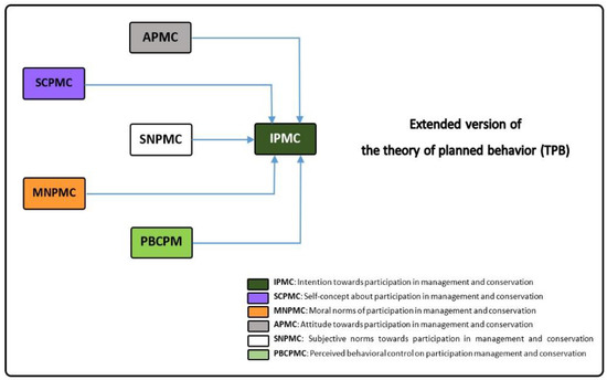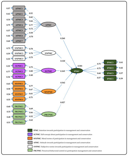 Intention towards participation in management and conservation (IPMC), Attitude towards participation in management and conservation (APMC), Subjective norms towards participation in management and conservation (SNPMC), Perceived behavioral control on participation management and conservation (PBCPMC), Self-concept about participation in management and conservation (SCPMC), Moral norms of participation in management and conservation (MNPMC).