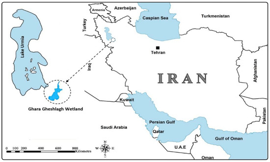 Ghara Gheshlagh wetland is located in the northwest of Iran and in the southeastern part of Lake Urmia (Figure 2). This wetland is located in the geographical area of the two provinces of West and East Azerbaijan and has an area of about 48 square kilometers. This means that the wetland is located on the border between the two provinces of West and East Azerbaijan in Iran. Its average height above the sea level is 1275.9 m. The water depth of this wetland is about 15 cm. It is noteworthy that its water depth varies in different seasons of the year due to many factors such as rainfall in wet seasons, evaporation in hot seasons, the consumption of water sources by different users, the extent of exploitation of underground resources in the wetland, and the decrease in the water level of Lake Urmia. The main livelihood and income sources of the villagers are agriculture and mobile/fixed livestock husbandry. The agricultural products of the farmers of the region are alfalfa, watermelon, wheat, barley, melon, tomato, beet, and orchards (apple and grape), among which a significant proportion is allocated to the first four crops. Today, about three-quarters of the region’s agricultural land is used for alfalfa, watermelon, wheat, and then barley. Only a quarter of the rest is allocated to other products. Alfalfa, meanwhile, is a crop that needs plenty of water, and wheat and barley are irrigated rather than rainfed [25]. Therefore, it can be said that the agriculture sector in this region is impressively water consuming. Handicrafts such as weaving kilims and carpets, hunting waterfowl, and fishing are other sources of income for local people. The presence of 185 species of native and migratory birds, numerous mammals, and rare plant and aquatic species indicates the richness of this habitat as one of the main and ecological reserves. Ghara Gheshlagh’s biodiversity has made it one of the important habitats for natural vegetation and wildlife. This wetland is home to thousands of migratory birds (especially flamingos) that migrate to this area from distant areas every year during the cold season [25].