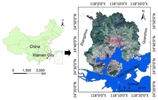 Figure 1. Geographical location and seawall distribution in Xiamen City.