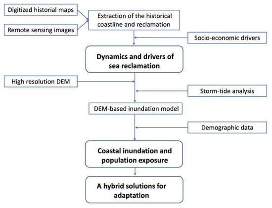 Figure 2 shows the overall methodology of the study conducted for incorporating the spatiotemporal dynamics of reclamation into a coastal flood impact model, in order to investigate the long-term influence of reclamation activities on coastal flood inundation and the consequent population exposure.
