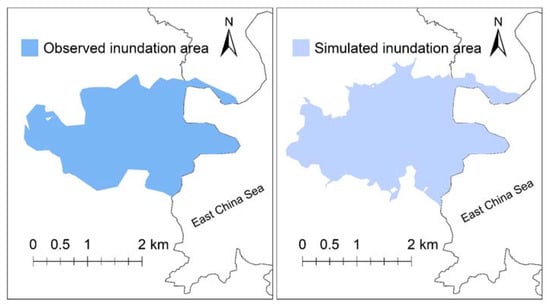 Regarding the validation of the inundation model, it has been a common problem in current studies, because sufficient data on observed inundation extent are lacking. Given that historically, Xiamen was frequently subjected to storm tide-induced flooding with a return period of about 10 years, the Xiamen Bureau of Water Resources extracted the observed inundation area of a 10-year storm-tide event in Maluan Bay of Xiamen. Therefore, the observed inundation map was compared with the results from inundation modelling, for the validation of the built DEM-based inundation model. As shown in Figure 3, the simulated inundation map fits well with the observed one, with 84.4% of the inundation area been correctly modeled. This demonstrates an acceptable performance of the built inundation model, and thus is applicable for modeling the inundation extent for other storm tide events.