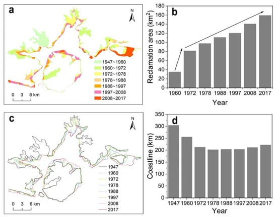 Figure 4. Spatiotemporal dynamics of land reclamation and coastline in Xiamen city from 1947 to 2017: (a) spatial distribution of added reclamation area; (b) statistics of reclamation area (compared to 1947); (c) spatial distributions of coastline; and (d) statistics of coastline.