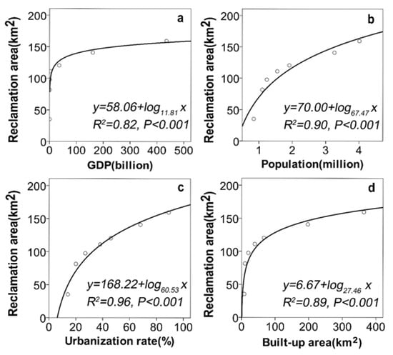 Figure 5. Relationships between land reclamation and (a) GDP, (b) population, (c) urbanization rate, and (d) urban built-up area.