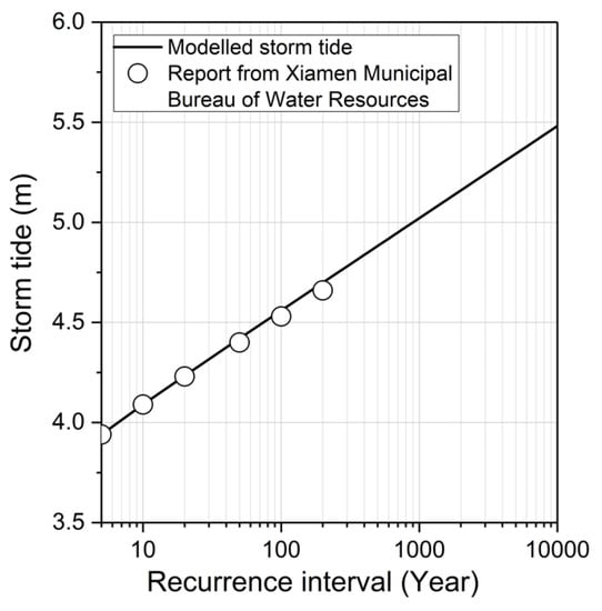 Storm surges are a natural phenomenon in which the water level rises abnormally when a storm with low atmospheric pressure and strong winds passes over the sea []. If a storm surge coincides with an astronomically high tide, a storm tide may emerge []. Based on the long-term tide observation data from 1960 to 2009 at the Gulangyu National Tide Gauge Station, we employed a generalized extreme-value distribution (GEV) to model the storm tide. It should be emphasized that the processes of periodic inundation occurring in low-lying coastal zones due to tidal influences are complex. Tidal surges can carry sediments that could elevate land on low-lying coasts, which could reduce flood potentials []. Such a complex coastal process has not been considered in this study, because the sediment deposition due to tide is not clear in Xiamen and there is lack of long-term observation data. In addition, land subsidence has also been proven to alter coastal flooding. According to the National Land Subsidence Prevention Plan (2011–2020) and Xiamen Geological Engineering Investigation Institute, ground subsidence is unlikely to occur because of Xiamen’s granite geology with low groundwater reserves, and no uplift has been observed historically. Thus, the vertical land movement was not considered in the study.