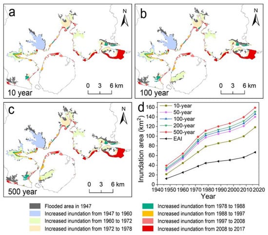 The inundation hazard maps corresponding to a series of storm-tide events from 1947 to 2017 are shown in Figure 7 (here, we take 10-year, 100-year and 500-year extreme water levels as examples to illustrate the inundation features). Generally, the inundated area under each storm-tide event increases rapidly with the expansion of coastal reclamation from 1947 to 2017. For example, considering a 10-year storm tide—a relatively smaller coastal flooding hazard—the inundated area increased from 21.43 km2 in 1947 to 44.58 km2 (+108.0%) in 1960, 67.04 km2 (+212.8%) in 1972, 78.69 km2 (+267.2%) in 1978, 85.25 km2 (+297.7%) in 1988, 89.80 km2 (+319.0%) in 1997, 99.81 km2 (+365.7%) in 2008 and 118.47 km2 (+452.8%) in 2017. In the case of a 500-year storm tide—a relatively larger extreme coastal flooding hazard—the inundated area increased from 39.03 km2 in 1947 to 63.84 km2 (+63.6%) in 1960, 98.64 km2 (+152.7%) in 1972, 111.39 km2 (+185.4%) in 1978, 120.31 km2 (+208.2%) in 1988, 126.58 km2 (+224.3%) in 1997, 139.51 km2 (+257.4%) in 2008 and 159.10 km2 (+307.6%) in 2017. The consequent expected annual inundation (EAI) area also exhibits a stable increasing trend: its value increased from 12.33 km2 in 1947 to 25.12 km2 (+103.7%) in 1960, 38.06 km2 (+208.6%) in 1972, 44.50 km2 (+260.9%) in 1978, 48.18 km2 (+290.7%) in 1988, 50.73 km2 (+311.4%) in 1997, 56.31 km2 (+356.7%) in 2008 and 66.61 km2 (+440.2%) in 2017, with an annual average rate of 2.44% from 1947 to 2017. In the inundation area of 2017, built-up area is the major land use type, indicating that the urban socio-economic system is subjected to large impacts from coastal flooding.