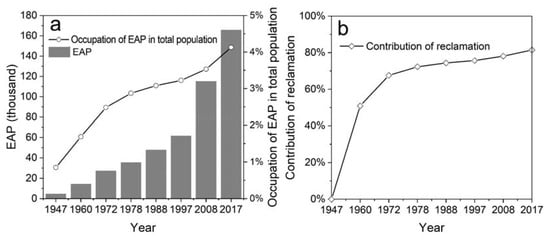 Dramatic land reclamation drives the dynamic trend of population exposure to coastal flooding. Figure 8a shows the population exposed to coastal flooding. According to the model, the expected annual population (EAP) exposed to coastal flooding was estimated to increase significantly from 1947 to 2017. Additionally, the EAP exposed to coastal flooding has in fact increased sharply, from 4.66 thousand (corresponding to 0.8% of total population in Xiamen) in 1947 to 165.55 thousand (corresponding to 4.1% of total population in Xiamen) in 2017. Two major factors contributed to this increase: population growth in the non-reclamation area, and the expansion of the reclamation area accompanied by the consequent population growth it accommodated. Therefore, we further quantitively identified the relative contributions of these two influences on the population exposed to coastal flooding. As depicted in Figure 8b, the growing population in reclamation areas dominates the population exposure, and its relative contribution is increasing, rising from 50.90% in 1960 to 83.92% in 2017. This is consistent with the reality that population and economic activities tend to be concentrated in coastal areas, because of the rapid urbanization there [].