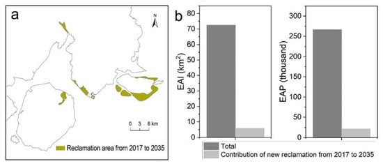 Figure 9. (a) New reclamation area from 2017 to 2035; and (b) expected annual inundation (EAI) and expected annual population (EAP) exposed to coastal flooding in 2035, under the scenario considering future reclamation.