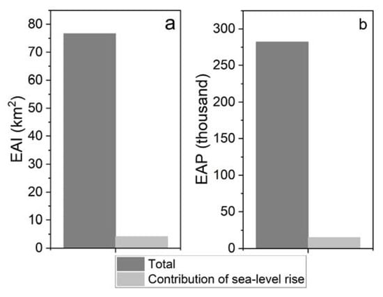 Figure 10. Extra impacts of a future 10 cm sea-level rise on coastal flooding. (a) Expected annual inundation (EAI), and (b) expected annual population (EAP) exposed to coastal flooding in 2035.