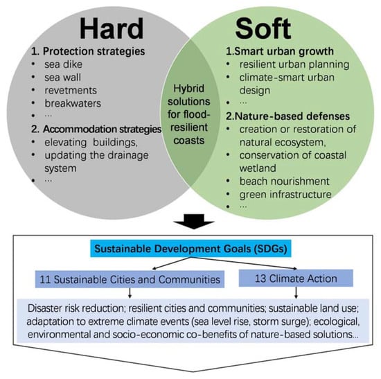 Figure 11. Hybrid approach for coastal flood resilience and adaptation. Our results suggest the importance of integrating both hard solutions and soft solutions for combating coastal flooding. Traditional hard defenses can be constructed in shorter timeframes, and take effect immediately. Soft solutions, such as nature-based coastal defenses, on the other hand, are more cost-effective, sustainable and eco-friendly. The hybrid approach is highly related to coastal sustainability, by contributing to the “climate actions” and “sustainable cities and communities” of the Sustainable Development Goals (SDGs).
