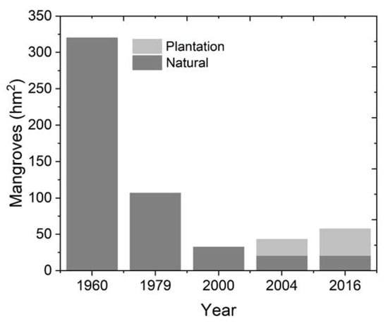 Figure 12. Historical changes in mangrove area in coastal Xiamen from 1960 to 2016, including both natural and plantation mangroves.