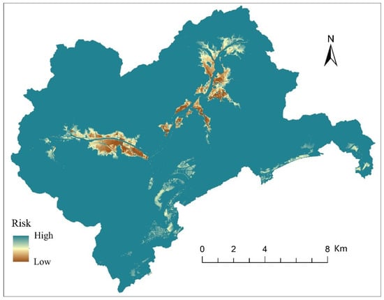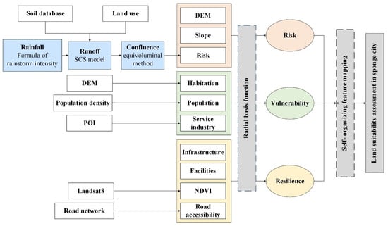 The losses of population and economy are essential criteria for assessment of the disaster risk in rain–flood cities [,]. Thus, population and economic vulnerability should be included in the index system of land suitability evaluation for sponge cities. By doing so, we can predict disaster risk at all stages of planning and select the land with a low degree of waterlogging disaster for urban construction and fixed asset investment. Therefore, there is an urgent need to explore a comprehensive evaluation method for the land suitability of sponge city construction, which not only considers the disaster risk with the background of urban waterlogging but also reflects the integrity of ecological, social, economic, and other factors according to local conditions [,].