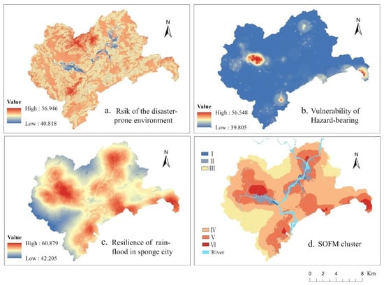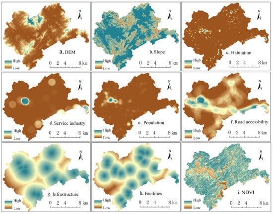 Figure 4a–c shows the following features: (1) There is a higher risk of waterlogging disasters in the northern and southwestern regions due to the higher elevation and lower risk in the region’s center where the terrain is gentle and rivers meet. (2) The central area of Ebu town is highly vulnerable because of its dense population and economic development. In addition, catering services, financial services, scientific research and education, companies, entertainment, retail, hotels, and other service industries are concentrated here. (3) The greater the road accessibility, the closer it is to infrastructure, shelters, or ecological sponges, the higher the city’s resilience to manage rain–flood hazards. The accessibility of roads shows that the main traffic routes in the region run through the east and west, followed by the north and south. Infrastructure integrity is characterized by the distance from telecommunications, medical services, substations, and communications equipment. The utilization of existing areas is represented by the distance from schools, parks, green spaces, temples, and other public shelters.