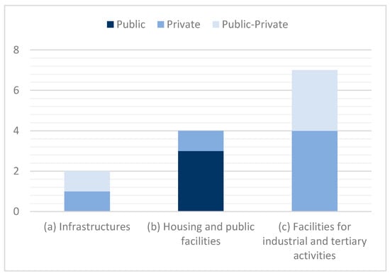 Any private person, natural or legal, as well as public administrations, can develop a PSI [38]. Overall, private promoters, either through the direct adjudication of a PSI (7) or through its use after public construction (4), are the main beneficiaries. Only three of the PSIs are completely public (Figure 2). Broadly speaking, the scheme applies the neoliberal logic, under which any urban intervention should be economically productive, with private enterprise emerging as the leading player in spatial planning. The lack of coordination, the overblown scale and the widespread arrogance behind the construction boom in Spain [16] are the identifying characteristics of the PSIs in Castilla–La Mancha.